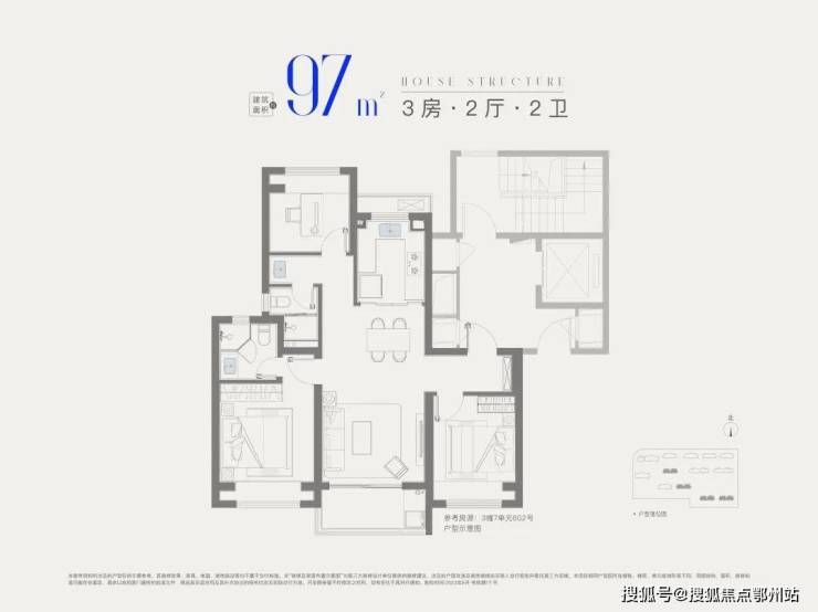 建面约97㎡3房2卫, 升级版大3房,入户玄关+主卧套房设计 ,整体私密性更强,空间更为宽敞。