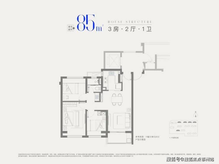 建面约85㎡3房1卫,做到 三开间朝南+全卧室带飘窗+卫生间干湿分离 +动静分离,非常紧凑的小3房。