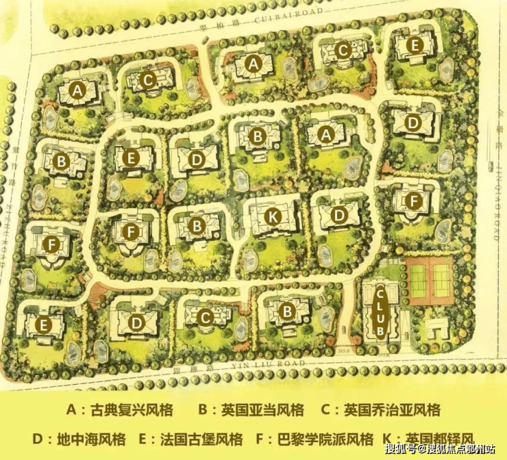 不同风格的建筑交叉分布于整个社区,绝大多数别墅的四周都至少有三种不同风格的建筑,四下望去,满眼尽是是不同的欧式风情。