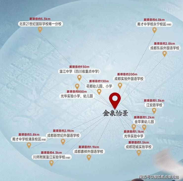 三公里范围内:伊顿慧智双语幼儿园、金苹果幼儿园、金太阳幼儿园等;中小学有光华实验小学、嘉祥实验外国语学校、温江中学、温江二中、成都七中实验学校、新世纪外国语学校(国际常春藤学校保送对口学校);