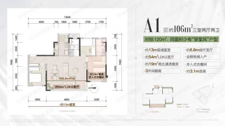 约106㎡户型主要分布在A地块北侧的高层中,采用2T3设计;