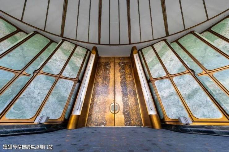 比如约56×11.5米的超尺度门庭,顶部以杭州折扇为造型灵感,寓意“藏风聚气”;四周还有12片巴西进口的百达翡绿奢石雕琢的玉石屏风;中间还有约9.6×5.3米的巨幅铜门,是由非遗传承人朱炳仁手工锻打,再现钱塘潮涌的磅礴气场