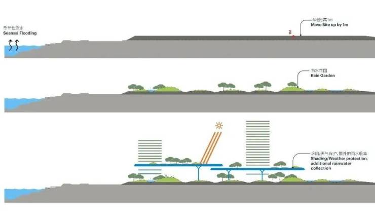 将地面空间开放给行人、绿植,不仅能美化环境,还能很好的应对气候环境所带来的洪涝挑战。(如上图)