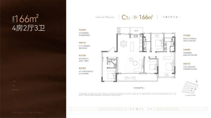 户型设计上亮点纷呈:比如270°的超大转角观景阳台或飘窗,把湖景和园景尽收眼底;设计了中西厨岛台和专属的家政间,生活更便捷;还有双入户动线、主卧套间化等细节,充分考虑了现代家庭的居住习惯和隐私需求。