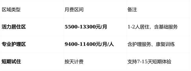 总费用区间:5500-13300元/月(根据房型、护理等级、入住人数组合)