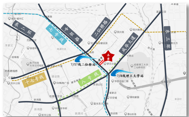 500M范围内,7/8号线交汇(理工大学站)7/17号线待建交汇(二仙桥站);三横三纵干道交通,六条主干道接驳全城。轨道/干道交通多重选择纵横全城