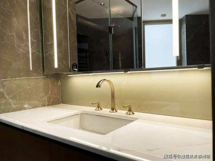 细节方面,项目采用了 拉米娜 的进口电视背景墙、顶级奢侈品牌 卡莉斯塔 的主卫龙头、 ABB 的智能化控制、 LG 的厨房台面,甚至是阳台的电动晾衣架、水槽、吊柜都是交付标准。