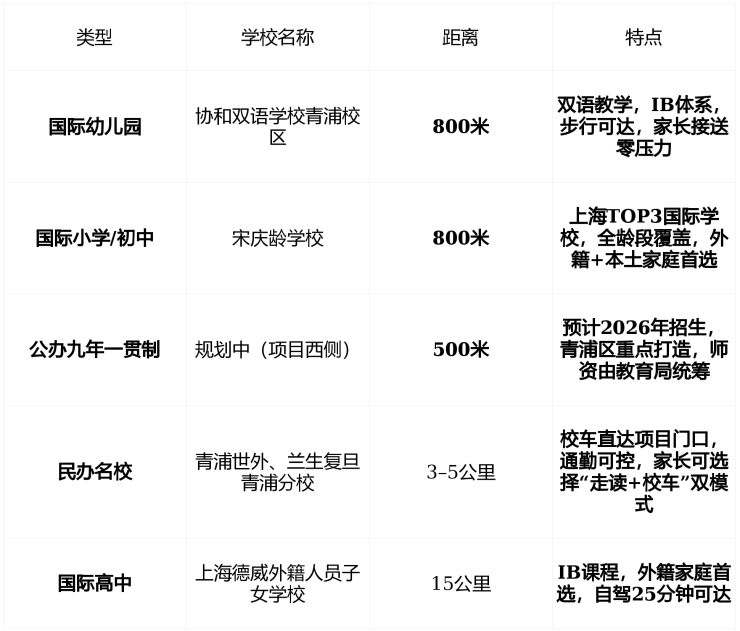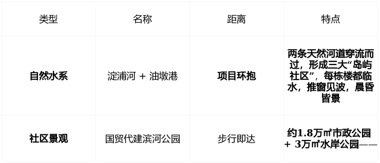 | 文化地标 | 青浦环城水系公园群 | 5–8公里 | 香雪公园、长岛公园、如心公园 已建成, 2026年青浦区重点打造“城市湿地生态网络” |