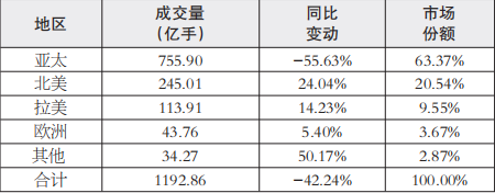 金融类衍生品总成交量为1038.10亿手,同比下降46.71%,占场内衍生品总成交量的87.03%。其中,金融期货成交量为198.31亿手,占比19.10%;金融期权成交量为839.80亿手,占比80.90%。