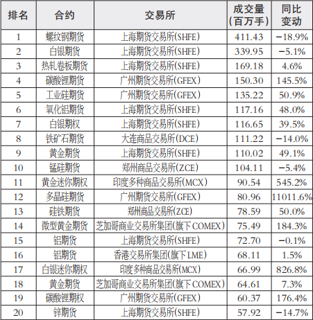 2025年,成交量排名全球前三的金属类场内衍生品合约分别为上期所螺纹钢、白银和热轧卷板期货。此外,上期所氧化铝、黄金、铝、锌期货和白银期权,广期所碳酸锂、工业硅、多晶硅期货和碳酸锂期权,大商所铁矿石期货,郑商所锰硅、硅铁期货成交量也位列全球金属类场内衍生品前二十。