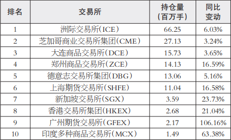表为2025年年末全球交易所场内商品衍生品持仓量排名情况
