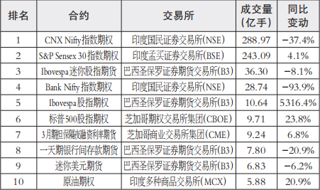 按成交量计算,2025年排名全球前十的场内衍生品合约以金融类品种为主,涉及6个股指类、2个利率类、1个外汇类和1个能源类,包括B3的4个品种、NSE的2个品种,以及BSE、芝加哥期权交易所集团(CBOE)、CME和MCX的各1个品种。其中,NSE的Bank Nifty指数期权成交量同比下降93.9%,主要是由于印度监管部门采取措施抑制衍生品市场过热,包括下架Bank Nifty的周度期权,大幅提高合约最小面值等。相反,B3于2025年推出了Ibovespa的周度期权,导致Ibovespa股指期权成交量同比增长5316.4%。