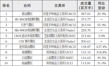 2025年,成交量排名全球前十的场内商品期权合约涉及郑商所2个品种、上期所1个品种、MCX 3个品种、Nadex 3个品种、CBOE 1个品种。成交量排名全球前三的场内商品期权合约包括MCX原油、天然气期权(均为小合约,分别是CME相应合约规模的1/10和1/8)和CBOE基于体育赛事预测的NFL-WNCHP胜场事件期权。此外,上期所白银期权位列全球场内商品期权合约第九。