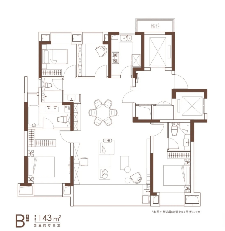 143㎡ 10,200 – 11,500 146万 – 165万 四室三卫,双阳台,主卧带飘窗,改善家庭首选