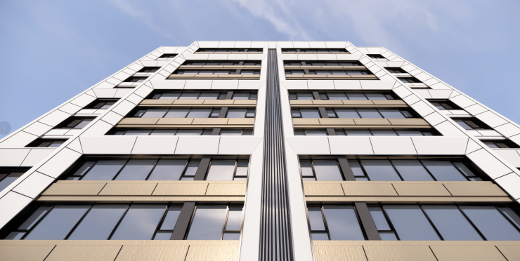 外立面:石材+铝板+真石漆组合,现代简约风格,质感耐看
