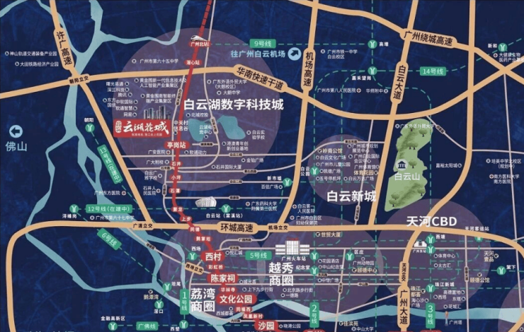更为令人振奋的是,品实云湖花城的交通价值不仅仅局限于地铁8号线本身。通过短短3站的地铁行程,居民即可换乘至广州白云站。广州白云站作为亚洲最大的交通枢纽之一,是集高铁、普铁、地铁、公交等多种交通方式于一体的超级枢纽。它的建成通车,标志着广州正式迈入了“高铁进城”的新时代。从这里出发,您可以快速通达粤港澳大湾区的各个城市,无论是前往深圳、珠海享受海滨风光,还是去往佛山、东莞洽谈商务,亦或是在节假日乘坐高铁远行探亲旅游,都变得异常便捷。这种“站内换乘、无缝衔接”的交通体验,极大地拓展了居民的生活半径,让“一小时生活圈”从概念变为现实。