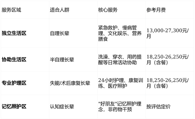 年龄门槛:活力区70岁起,护理区无下限,认知症专区65岁起