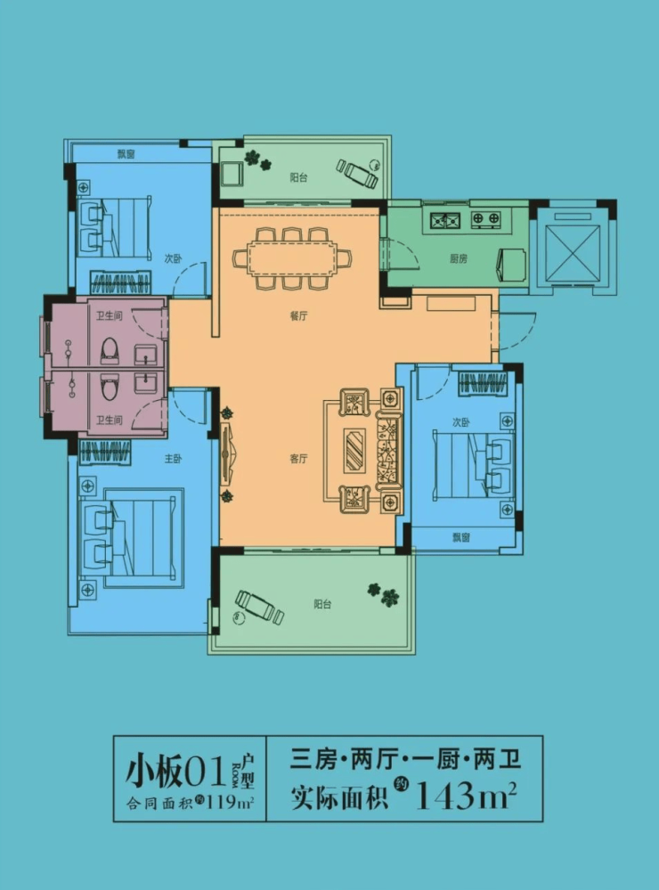 02、03户型:两房两厅一卫,三面都是朝景观面,5.8✖2.4的大阳台,客厅开间3.4米