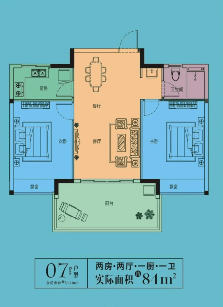 07户型:两房两厅一卫,5.4✖2.4的景观阳台,两卧室全朝阳,客厅开间3.6米