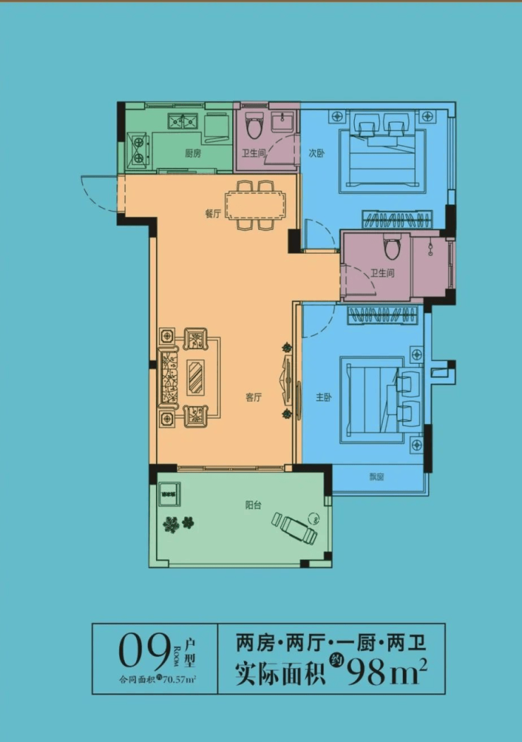 建筑面积:70平米,实得面积98平米南北各一个卧室