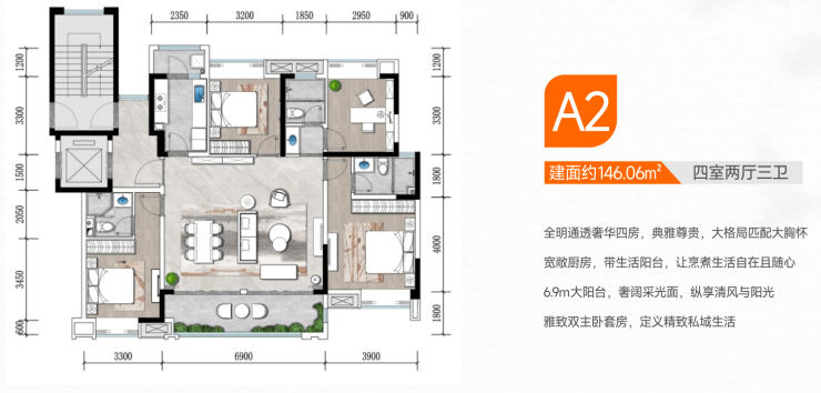 5.产品能打:146-180㎡纯改善户型,得房率高;45㎡超大共享厅+6.9m观景阳台,180㎡做五房双主卧套房,3.3-3.9m奢阔面宽,全景飘窗户户采光
