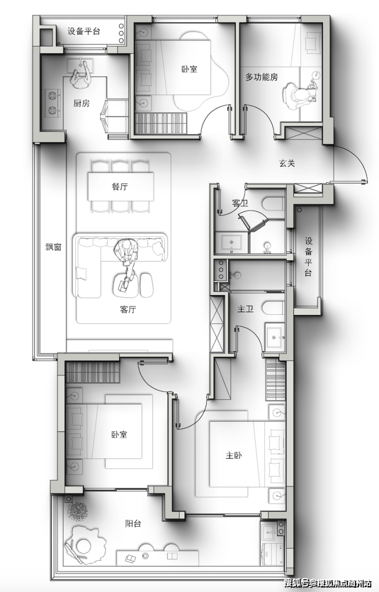 比如建面约117方的户型,不仅做出了四房两卫的功能,直接降低了四房的总价门槛,给想买的人省下了一辆车的钱。关键还做了一个2米左右进深的观景阳台,它仿佛悬浮于河岸之上,可以把楼下的滨水景观一览无余,在室内也能做到跟园区景观、跟城市的深度交融。