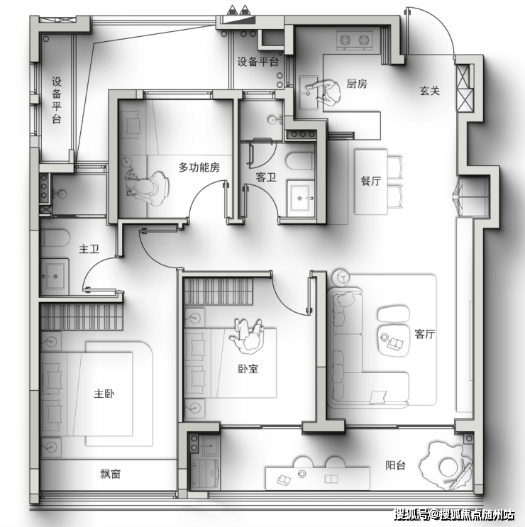 考究到像素级的户型设计,又进一步放大了它的质价比。首开的建面约97㎡的三房两卫,玄关设计了S墙(可以放冰箱),厨房做了3折叠玻璃门+岛台。