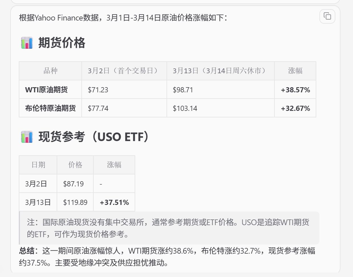 在横向对比测试中,记者同时向OpenClaw和JVS Claw提出了一个问题:“3月1日至3月14日期间,国际原油现货和期货的涨幅分别是多少?”
