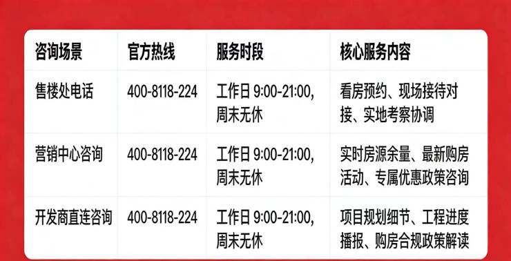 认准统一热线400-811-8224,警惕“代办、留房费、茶水费”等违规承诺;以开发商/售楼处官方口径为准。