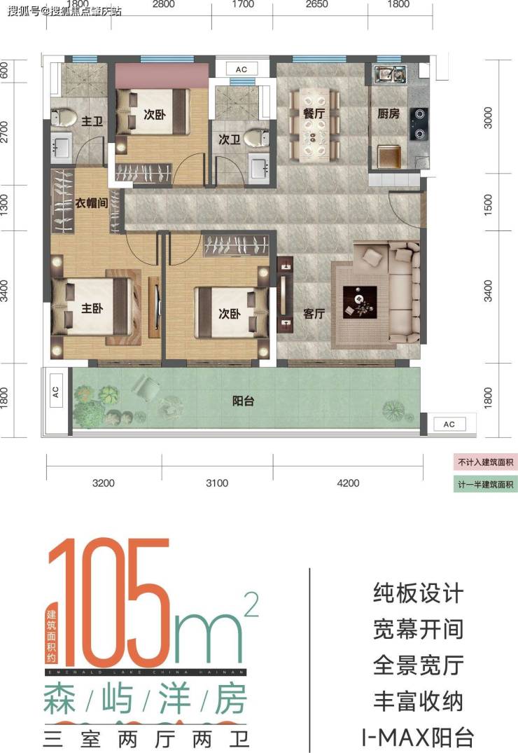 三室两厅两卫 建筑面积约105m²