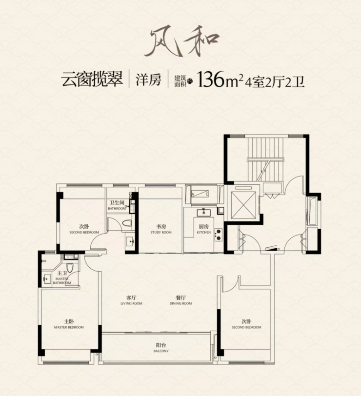 洋房:11F,主力户型117–143㎡,四开间朝南,双联阳台,全明通透