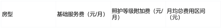 费用包含房间使用、公共区域维护、营养配餐、日常清洁及全部文娱活动参与。