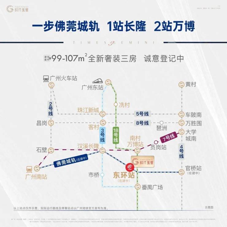 交通便利性是时代珑星的一大亮点。项目位于佛莞城轨东环站上盖,仅150米即可步行到达,预计开通后可快速接驳大湾区主要城市。东环站建成后,1站可直达长隆站,2站到万博CBD,并可无缝换乘地铁2号、3号、4号、7号、18号等线路,实现全城便捷通勤。