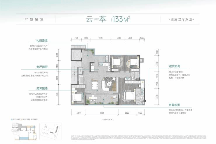 – **超奢空间**:建面约112㎡的户型可享超配4房大方厅,采用LDKB一体化设计,消除了空间界限,打造出生活丰盈的场景,书房空间巧妙打通,双阳台对望,让室内更加通透;建面约133㎡的户型则拥有4房大双厅和奢阔主卧,幻变空间可根据家庭需求改造成书房、棋牌室等,满足家庭全生命周期的各种情景需求。