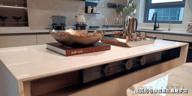 厨房额外标配带有收纳柜体的岛台空间,轨道式插座同样是交付标准,厨房台面是和内环某10万+项目同款材料: