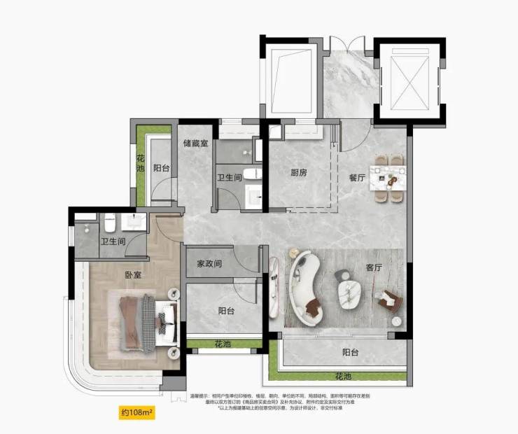 “宽幕视野” 南北通透双视野,主卧270°转角飘窗