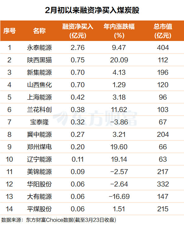 东方财富Choice数据显示,自今年2月初以来,杠杆资金融资净买入了一批煤炭股。具体来看,永泰能源净买入2.8亿元,位列第一;陕西黑猫净买入7500万元,位列第二。