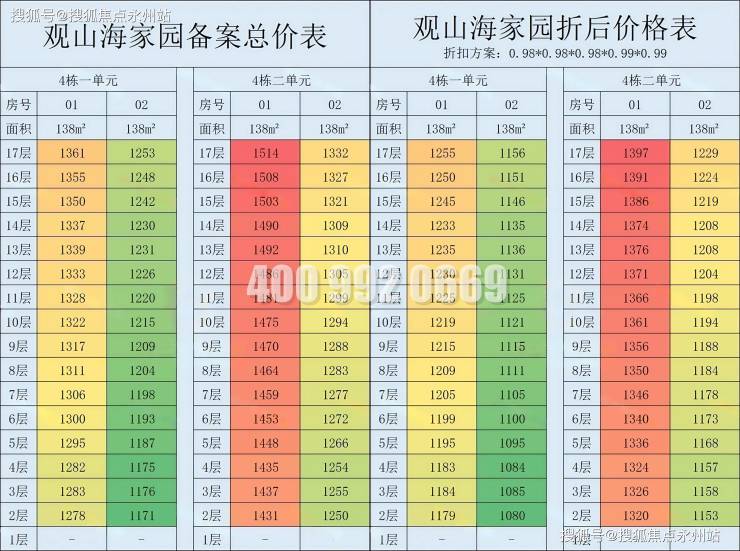 项目加推4栋价格详情:4栋是观山海家园的楼王,也是社区中唯一纯板楼楼栋,总高17层,共64套珍稀房源。