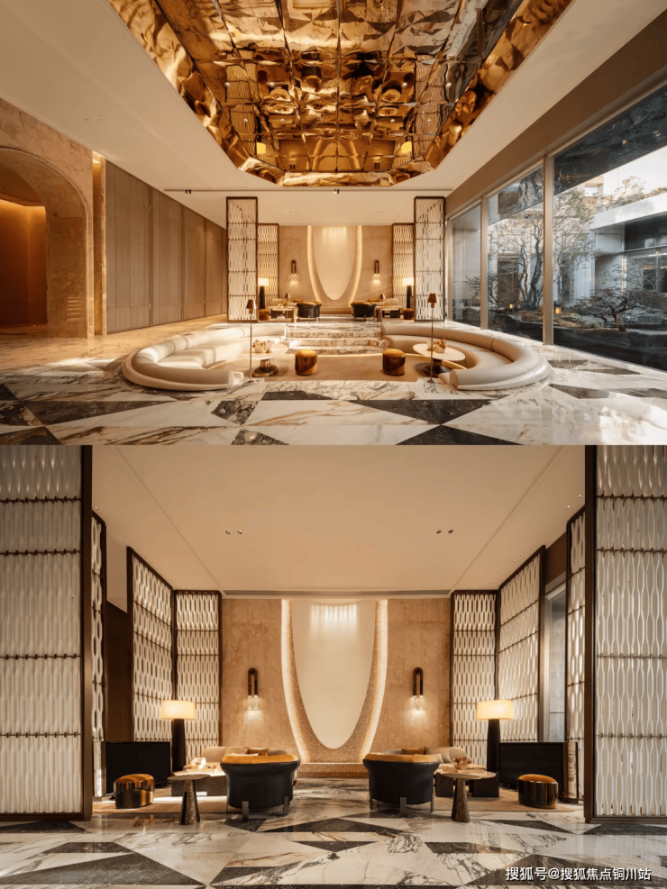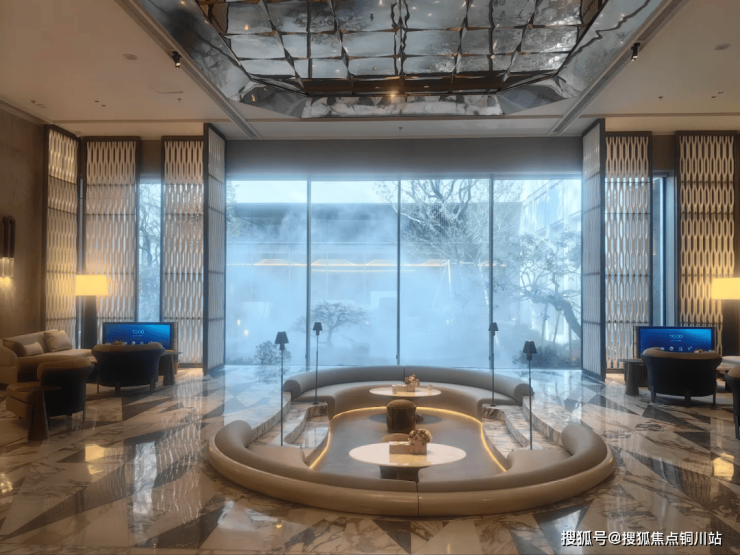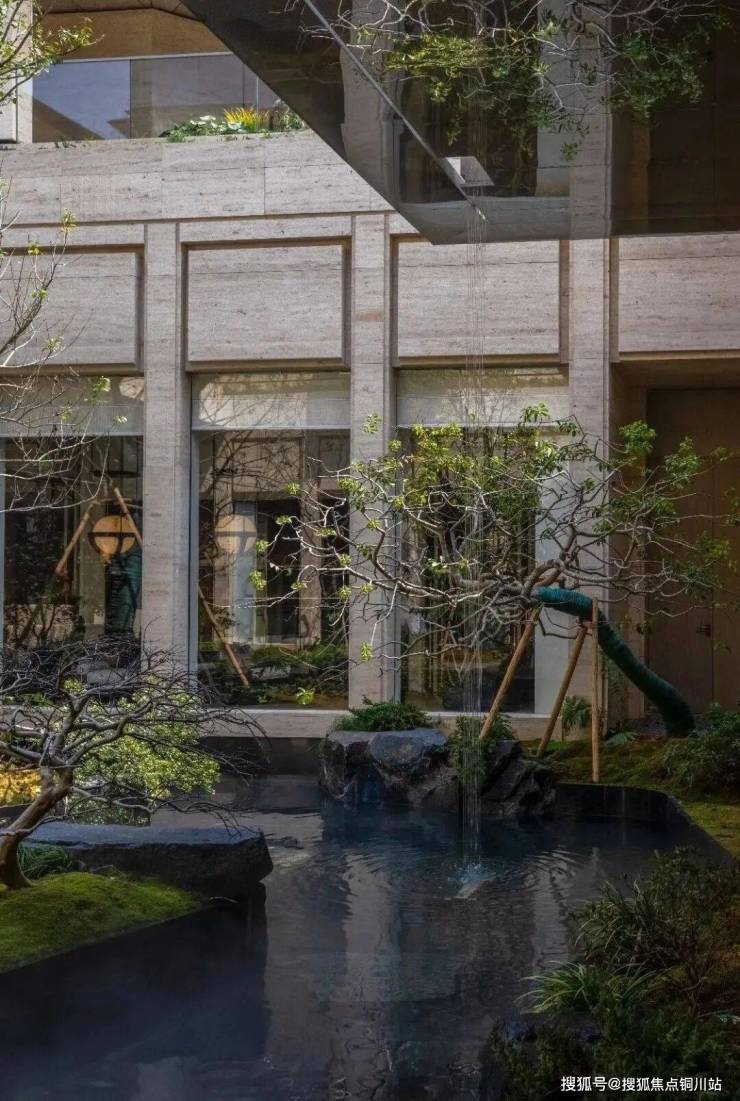 瀑布般的水幕如丝般细腻,将下沉庭院与上层空间巧妙地交织相连,水珠轻舞,幻化成朦胧之洲,营造出一种若有似无的默契。借助顶部镜面材质与四周的全景落地窗,这片角落的空间得以从多个角度融入同一幅画面,打造出既充满趣味又饱含意境的视觉盛宴。