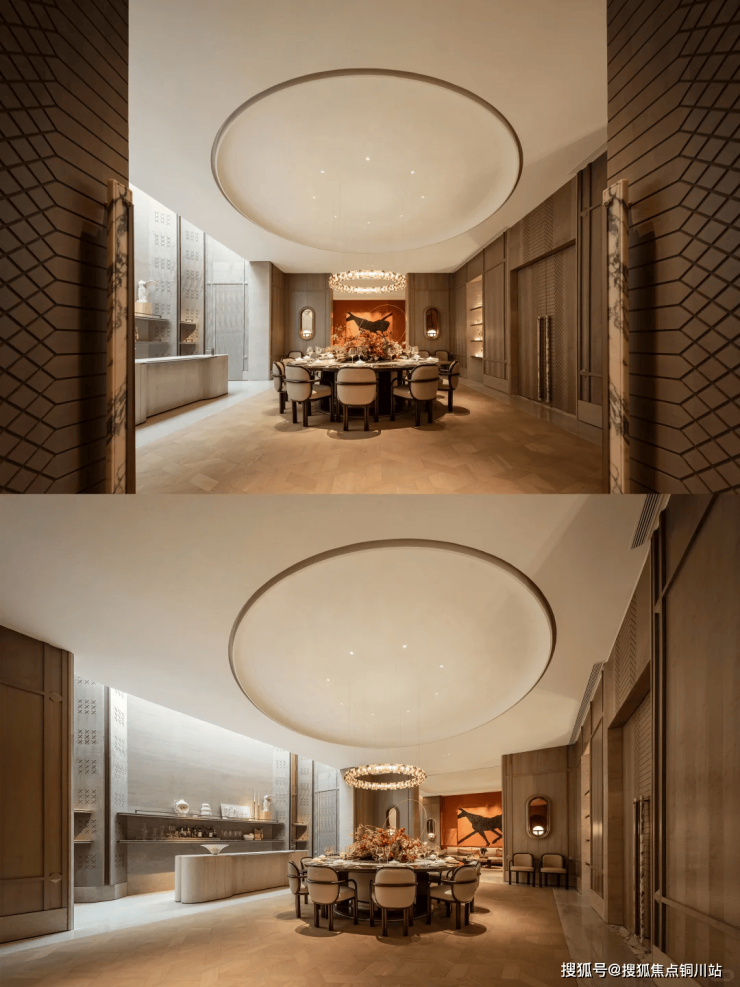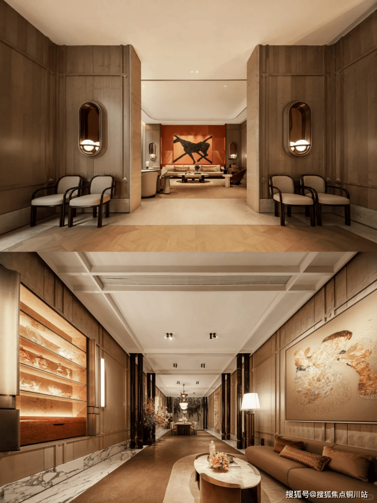 以“湖滨度假生活”为核心,示范区精心打造的公共区域及会所室内设计,灵感源于“水之形态,马之精神”,巧妙融合湖滨文化与现代艺术元素,营造出高端奢华度假酒店的轻松与惬意。选用烟粉色大理石材、流畅的弧形线条、温暖的木质墙面,辅以华美的大理石装饰,共同描绘出水的灵动与韵律。巧妙融入“马之精神”,通过白马雕塑与马主题的油画作品等元素,巧妙呼应,贯穿整个空间。这不仅为项目打造了独特的记忆标识,更与白马湖的意境相得益彰,共同营造出一种宁静与和谐的氛围。