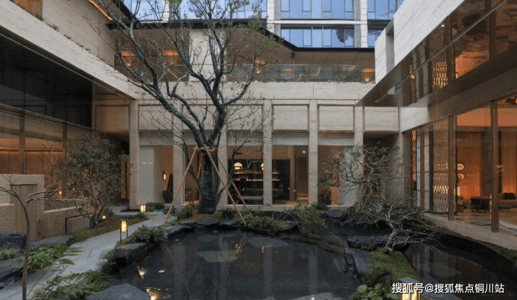 转过转角,眼前景象一亮,宽阔的下沉空间尽收眼底。清澈池水倒映着天光云影,与洽谈区无缝相接,室内外的氛围在此交融,营造出无边的和谐与扩展之美。