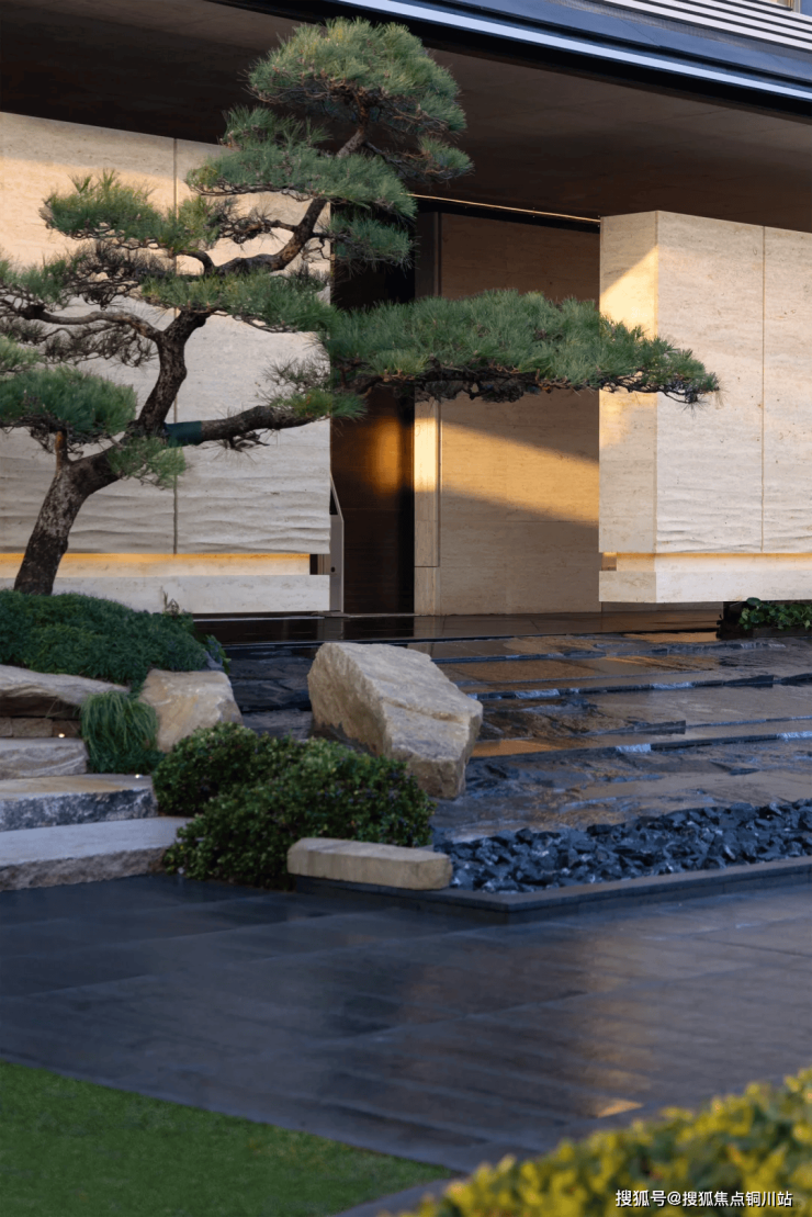 步入其中,内廊空间巧妙地将视线汇聚,而建筑与景观交相辉映之处,巧妙布置的留白成为了穿插其中的视觉亮点。在这里,温润的阳光与自然的草木、砾石相映成趣,柔化了内廊的线条,营造出一种既控制又放松的情绪氛围。